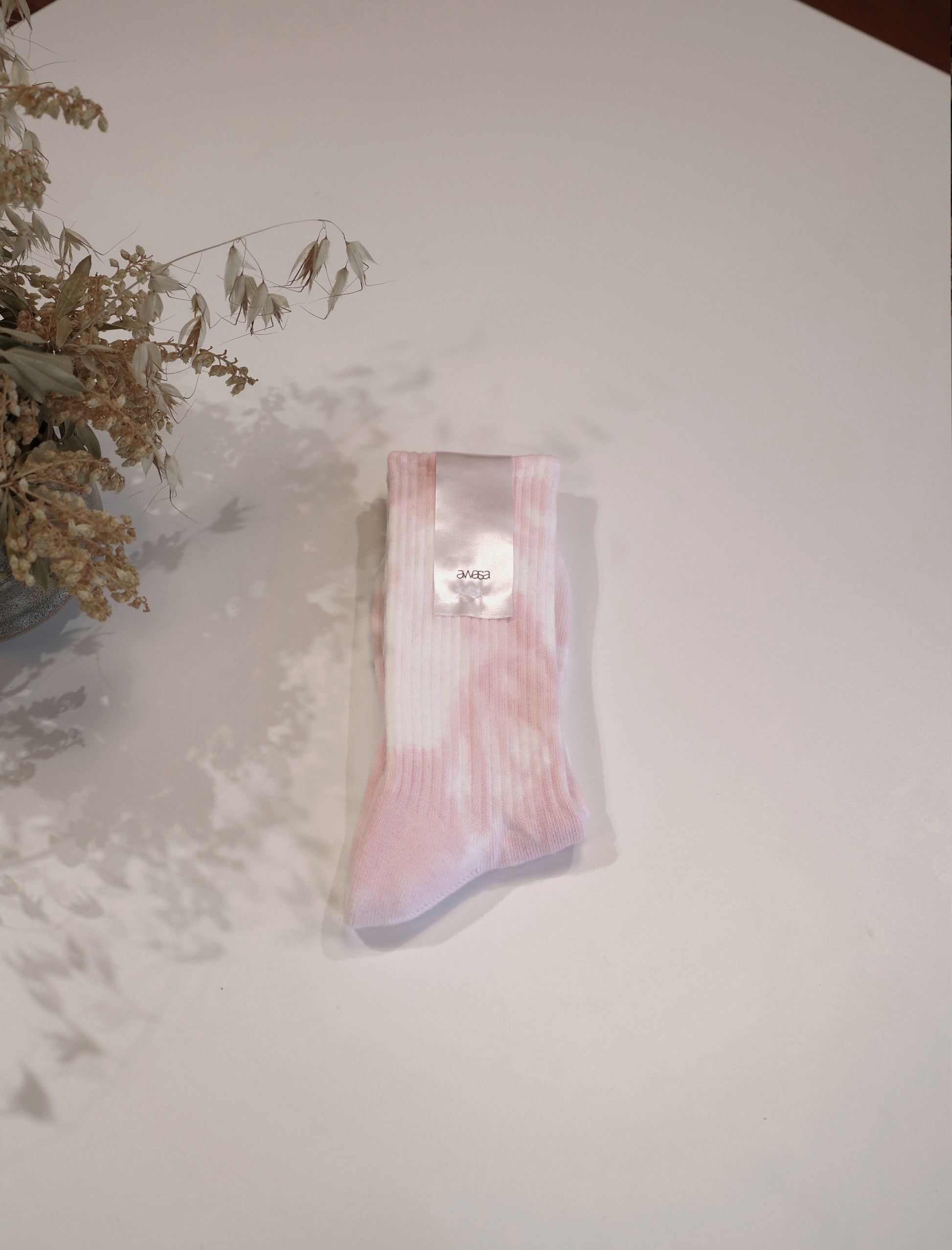 Produced in a specialized sock factory in Japan, knitted with a soft rib structure around the arch and instep for a secure fit, while the sole from toe to heel is finished with thick pile knitting to provide moisture absorption and cushioning. The yarn is treated at the fiber stage for antibacterial and odor-resistant properties. Each pair is hand-dyed with a tie-dye finish.