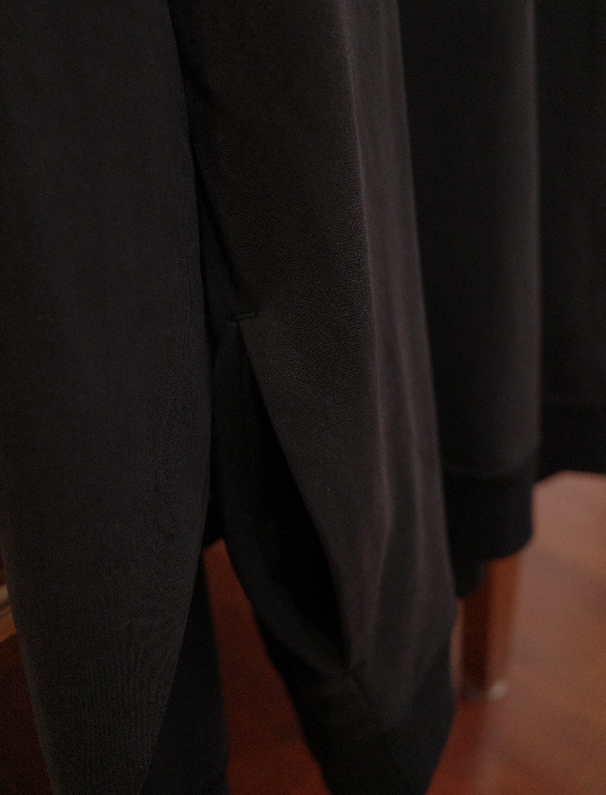 A relaxed-fit sweatshirt crafted from an original loop-back fabric. The face side uses 105-denier high-shrinkage cupro yarn, densely knitted on a 28G sinker machine to create a compact, high-density structure. The reverse side is composed of twisted extra-long-staple Suvin cotton, resulting in a soft and dry touch against the skin. The ribs are knitted from tightly twisted cotton yarn, producing a textural contrast with the cupro body. With a weight positioned between a sweatshirt and a long-sleeve T-shirt, the piece is suitable for year-round wear. After knitting, the garment is assembled at a factory that is known for its precise construction and consistent technical standards in Japan. Designed with set-in sleeves and pockets integrated into both side seams.